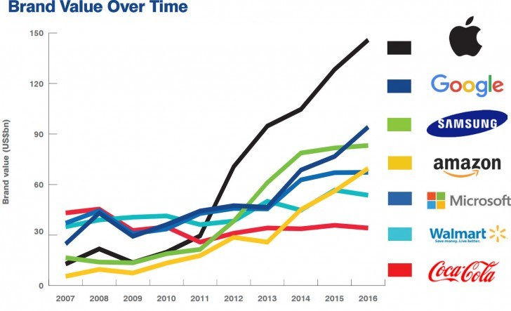 As Apple’s brand value tumbled 27% to $107.1 billion in 2016, Google’s increased to $109.5 billion. Amazon, with 53% brand value growth, was close behind at $106.4 billion.